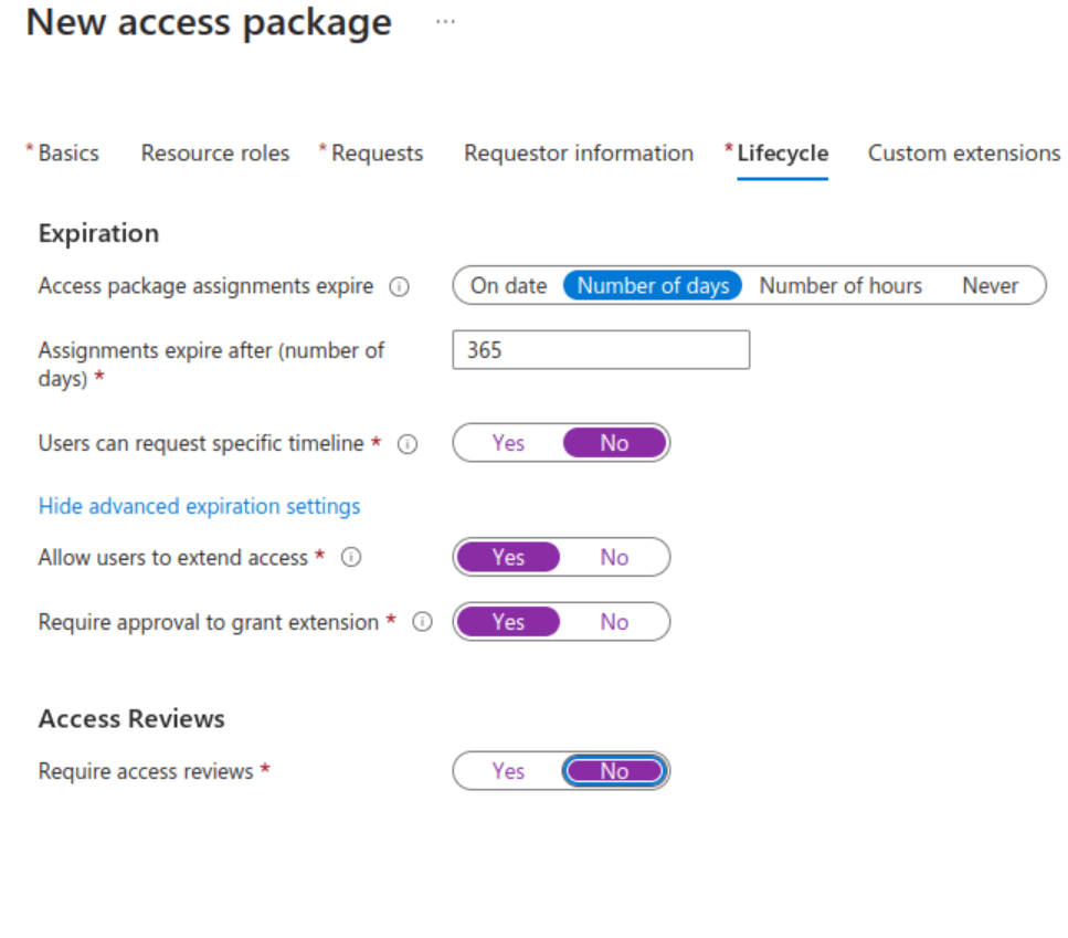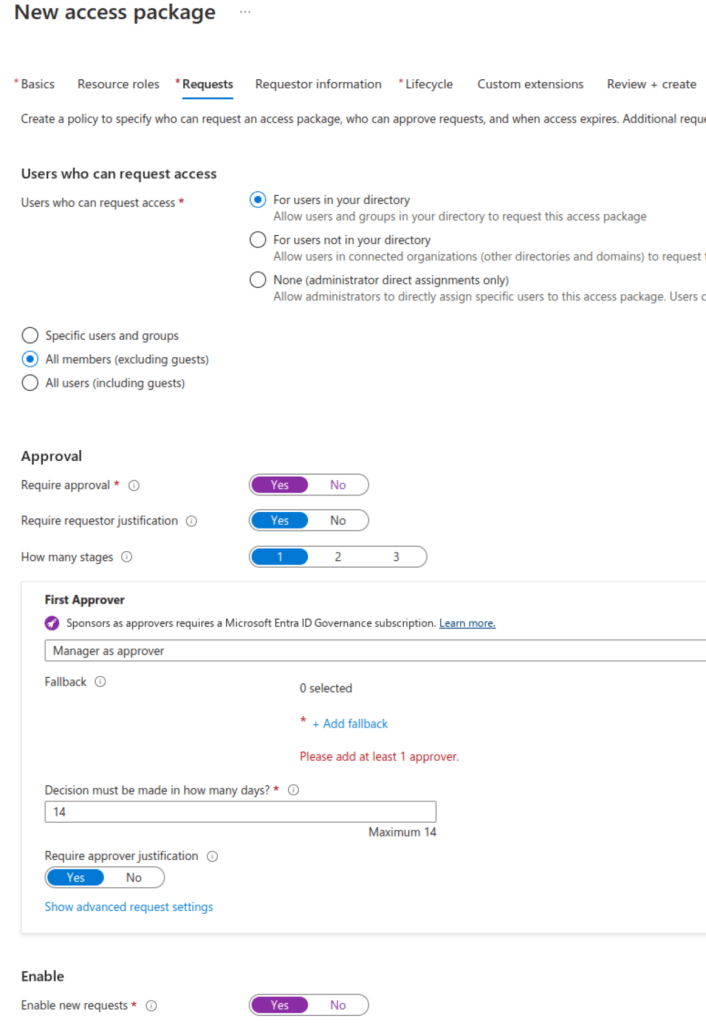 - You could also directly link the request to an access review. However, as I will be talking about access reviews more specifically in another article, I have set this to ‚No‘ here.