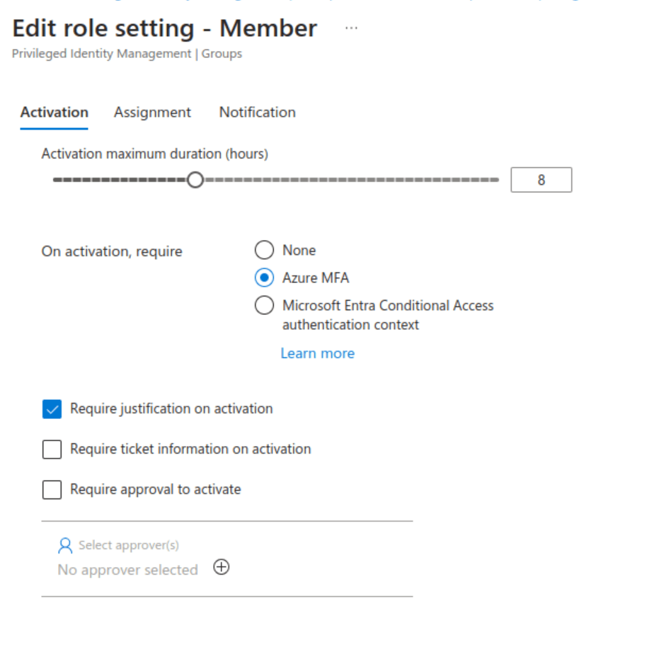 Eine bessere Variante ist eine eigene Entra RBAC Gruppe zu erstellen und diese ins PIM Management zu integrieren. Danach kann ich mir Rechte zur selber erstellten RBAC Gruppe via PIM bestellen und erhalte zeitgesteuert die Funktion aller verknüpfen Azure Standard Rollen. Die Rollenzuteilungen können jederzeit geändert werden aber der Bestellprozess bleibt unverändert. Ideal auch bei Reorganisationen etc.
