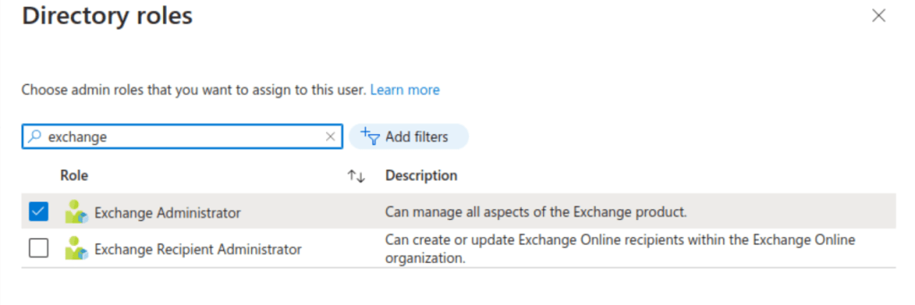 - Hier können nun die gewünschten Standard-Rollen direkt der Gruppe zugewiesen werden (Exchange Administrator, Sharepoint Administrator, Teams Administrator)